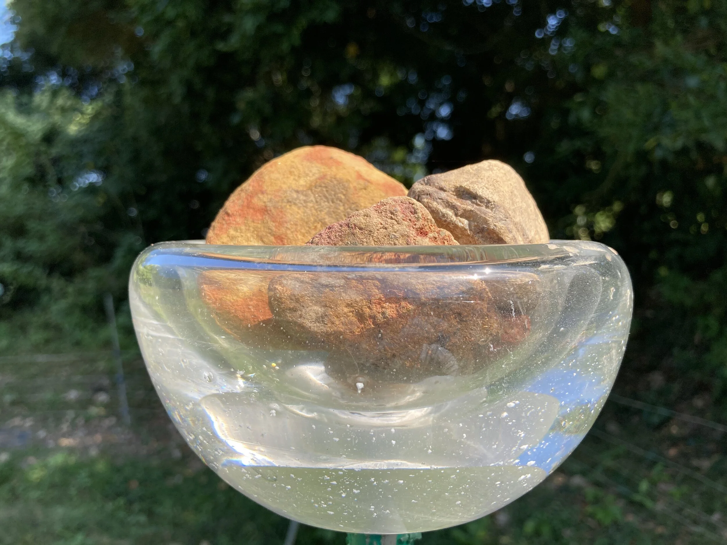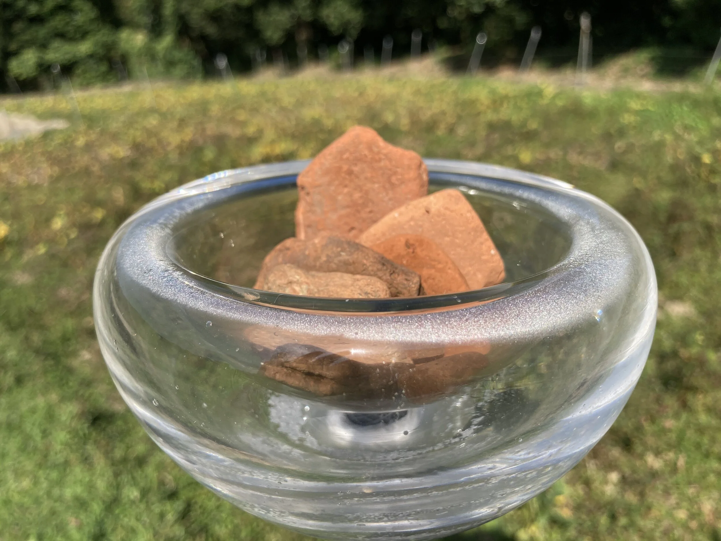 真山真水透動人, 山溪流水淙淙嗡,分形共氣築窩暖,黃澄澄的稻穂飄,波光粼粼魚在游,生生不息傳萬家。浮碗盛載了的微景觀盛載了荔枝窩的天然山石、溪水、瓦片、稻米、米魚、白米。